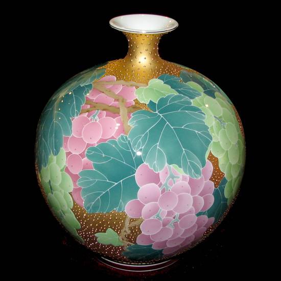 This is a porcelain vase with the golden plating made of 9999 gold. It has a relative light painting of grapes and leaves which is treated with high temperature.
