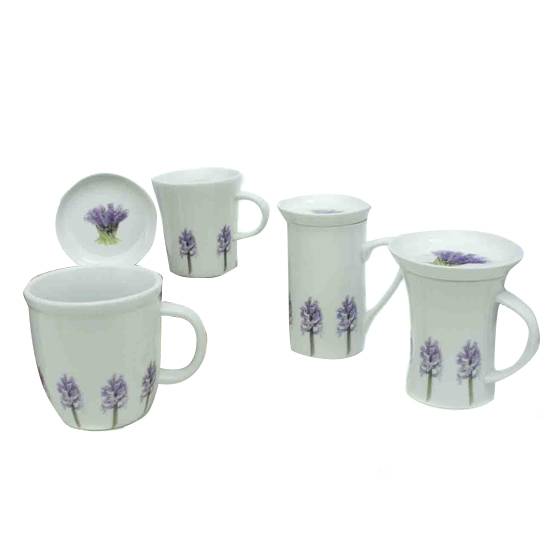 This is a set of porcelain ware with cups and lids. This set has prints of lavender with the plain white background. The design implies the concept of simple natural life with enjoyment.