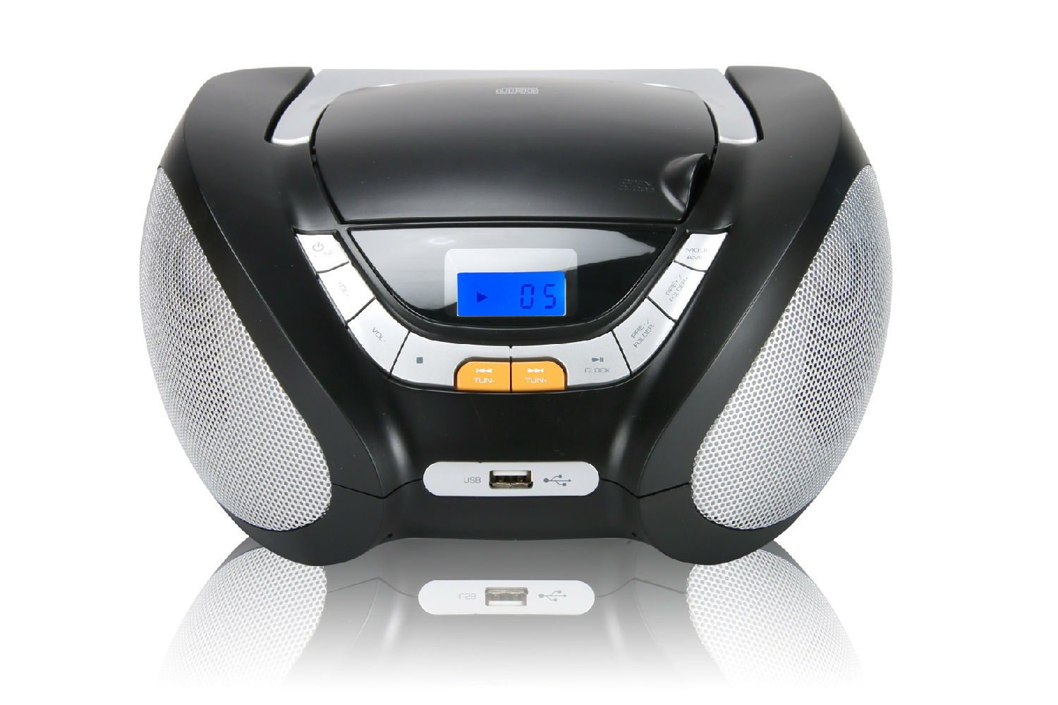 -Top Loading Single CD/ CDR-W -MP3 Playback -USB Interface -Repeat 1/ All Tracks/ Album/ Random Play -Program -PLL Tuning Radio, FM Only -20 Preset Stations -Automatic and Manual Search for Radio Stations -AMS (Automatic Memory Stations) -Aux-In Jack -Headphone Jack -LCD Display with backlight -Build-In High Performance Stereo Speakers -Output Power: 1.5Wx2