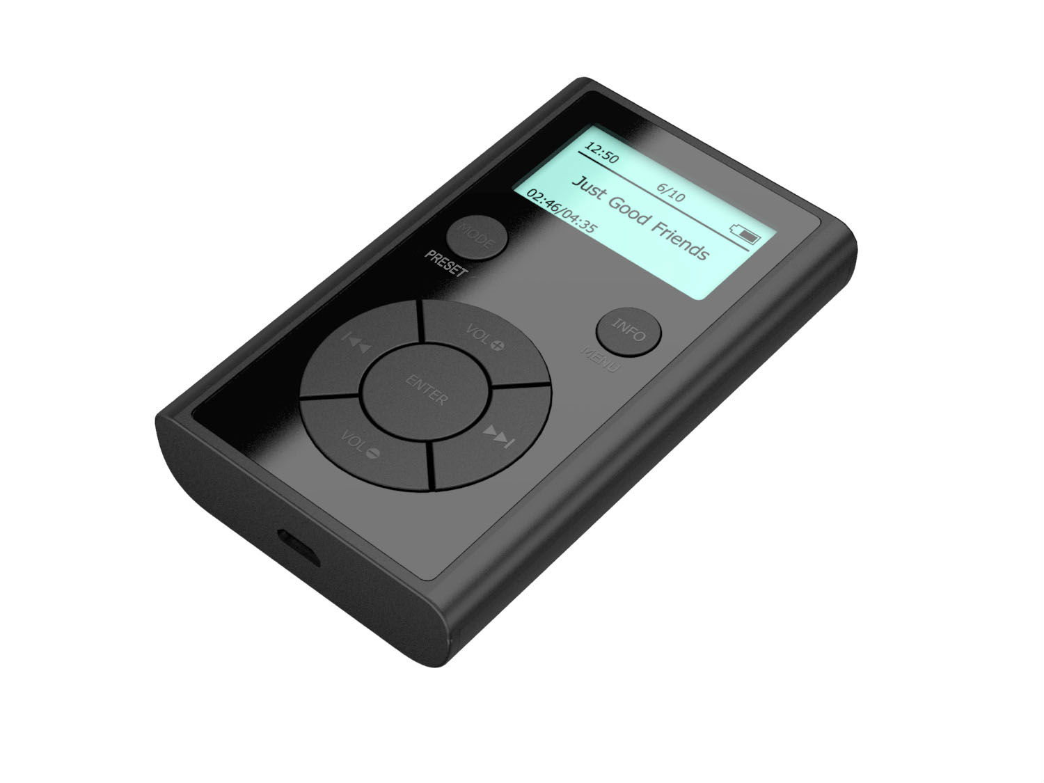 Displayed here is a digital audio broadcasting (DAB) radio in a compact and portable rectangular design. It has a lighted display screen and offers simple buttoned controls. This portable DAB radio can receive Euro DAB stations and offers crystal clear high quality sounds.