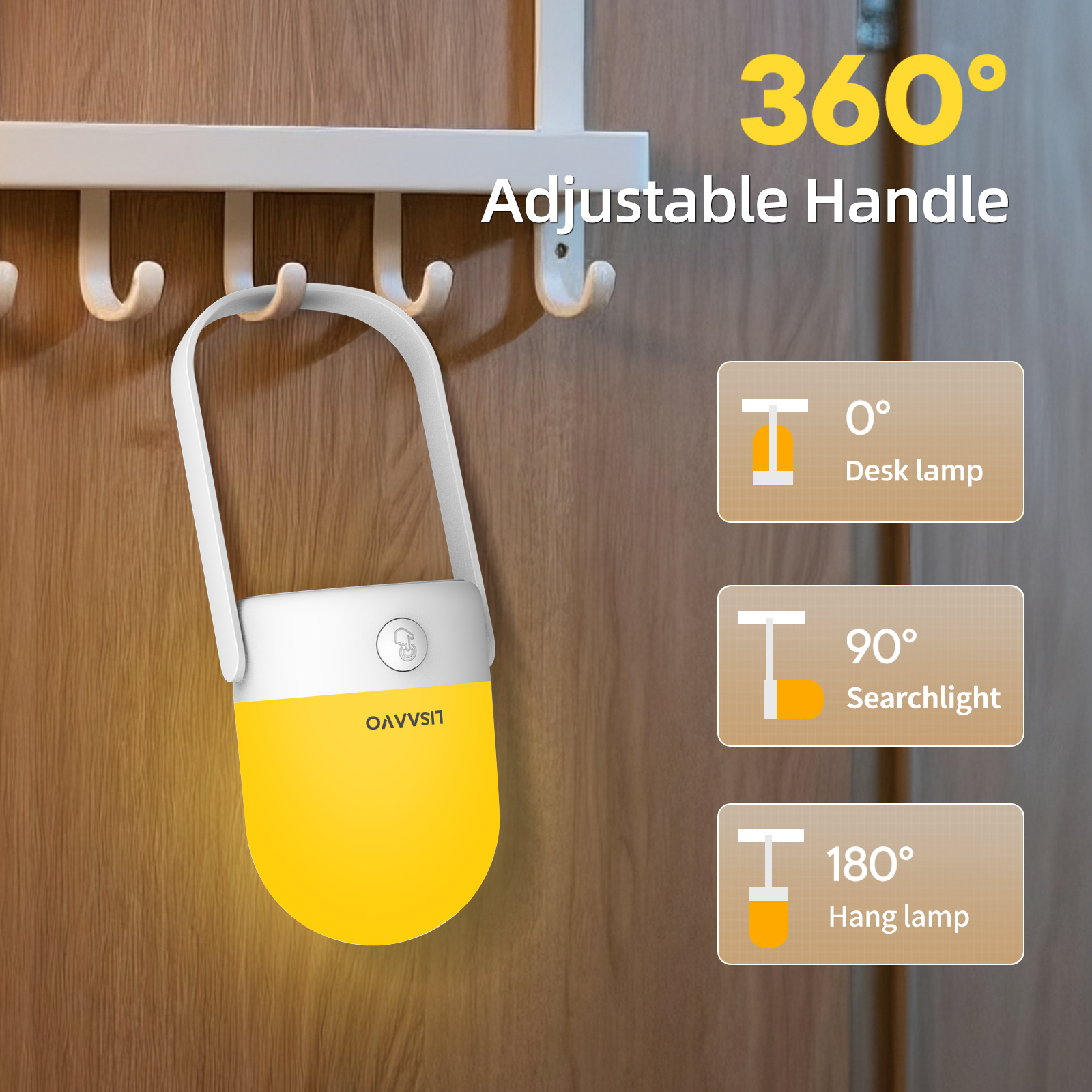 Easy touch-button operation combined with a rotating handle allows carrying, hanging, and flexible placement.