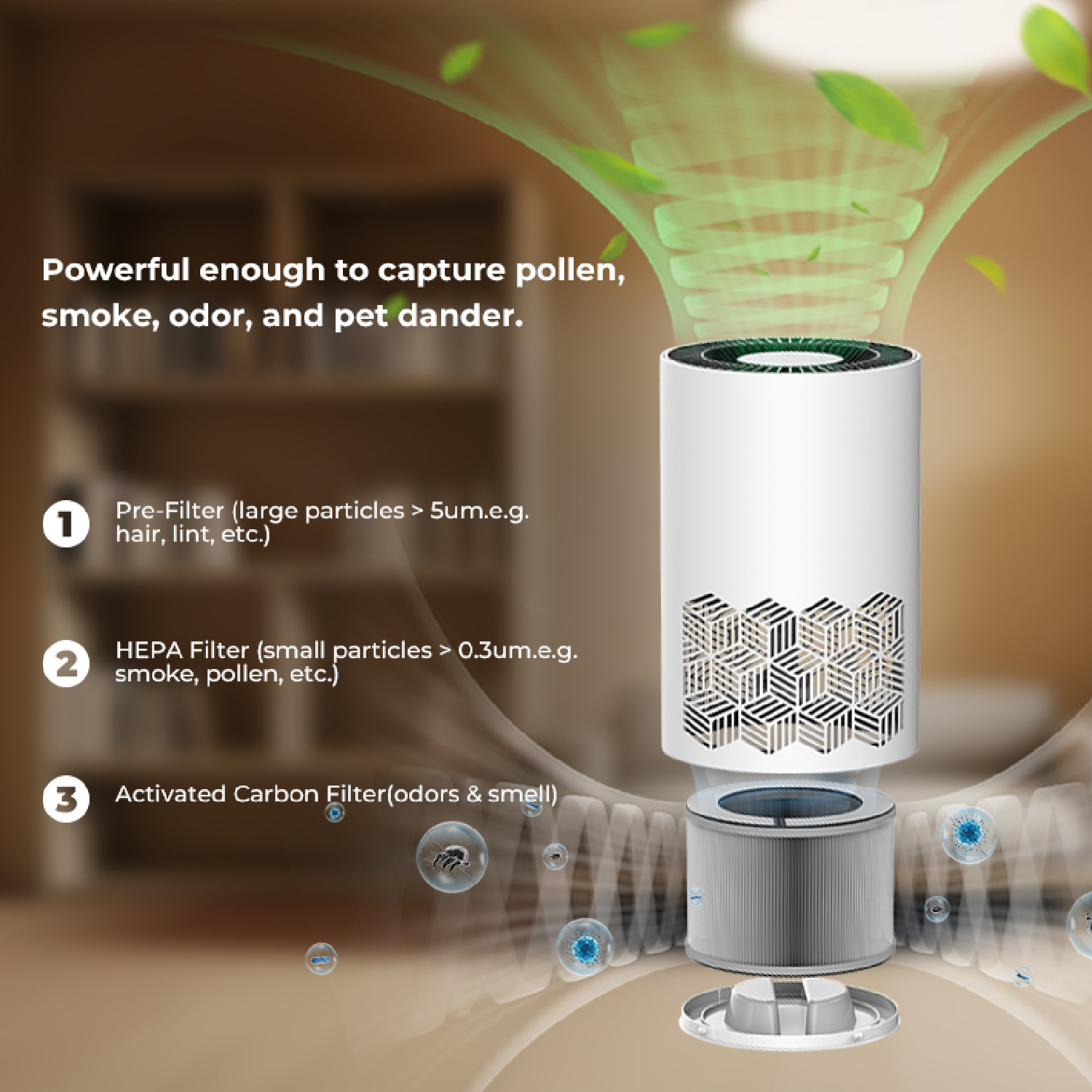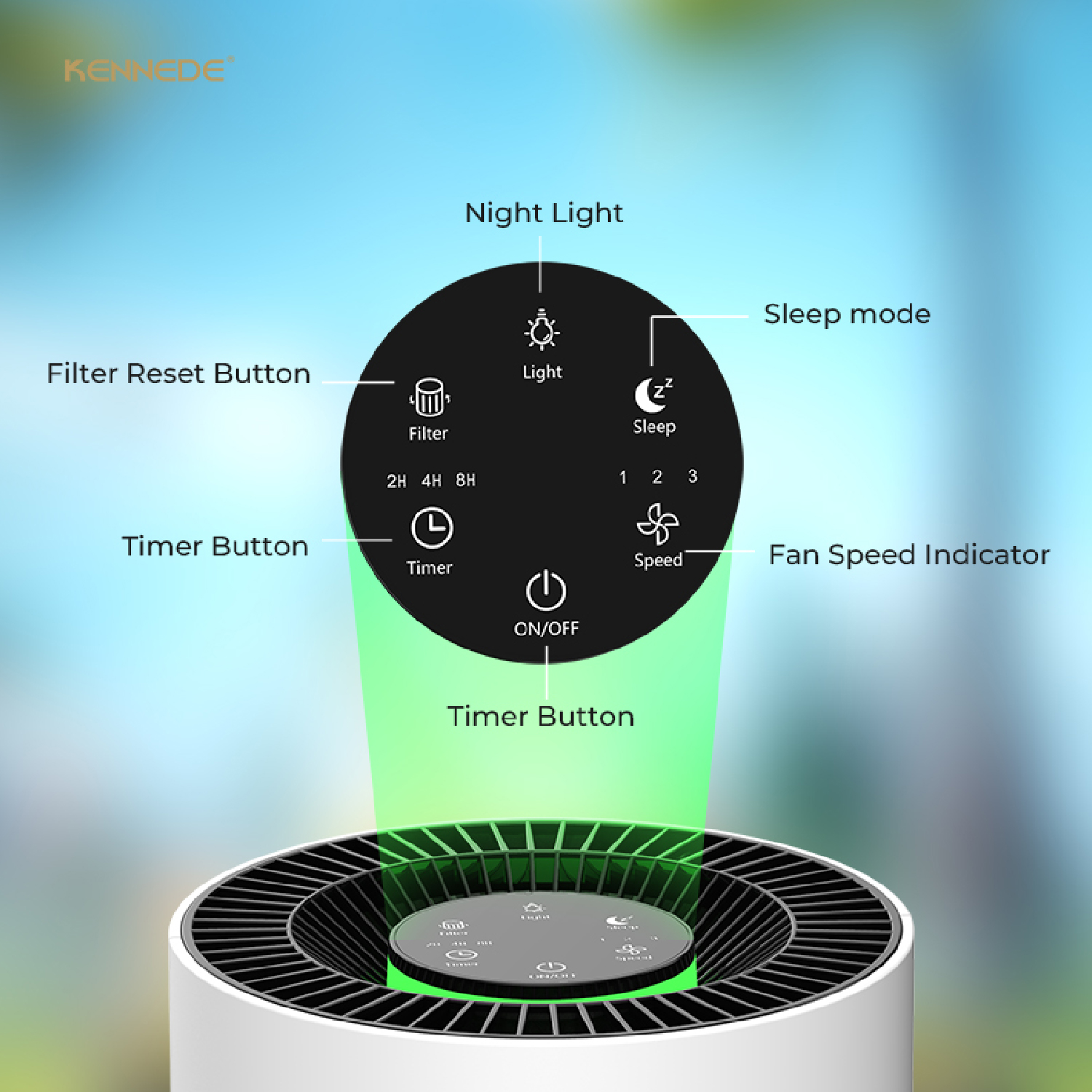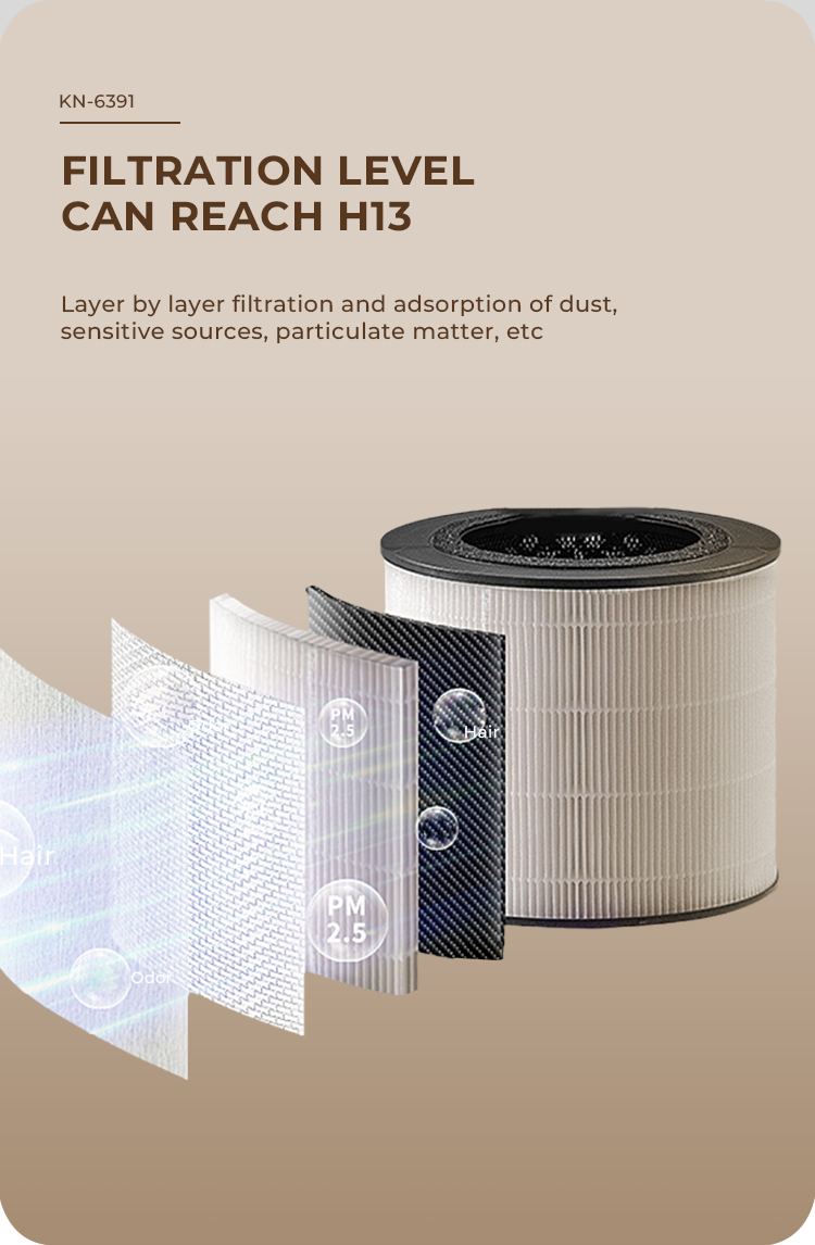 Meet the KN-6391 Air Purifier, designed to improve your indoor air quality effortlessly. It features a calming ambient light and a timer for your convenience. With a gentle sleep mode and easy touch controls, it's perfect for any room. Plus, it reminds you when it's time to change the filter and even includes a fragrance box for a pleasant aroma. Breathe easier with the KN-6391!