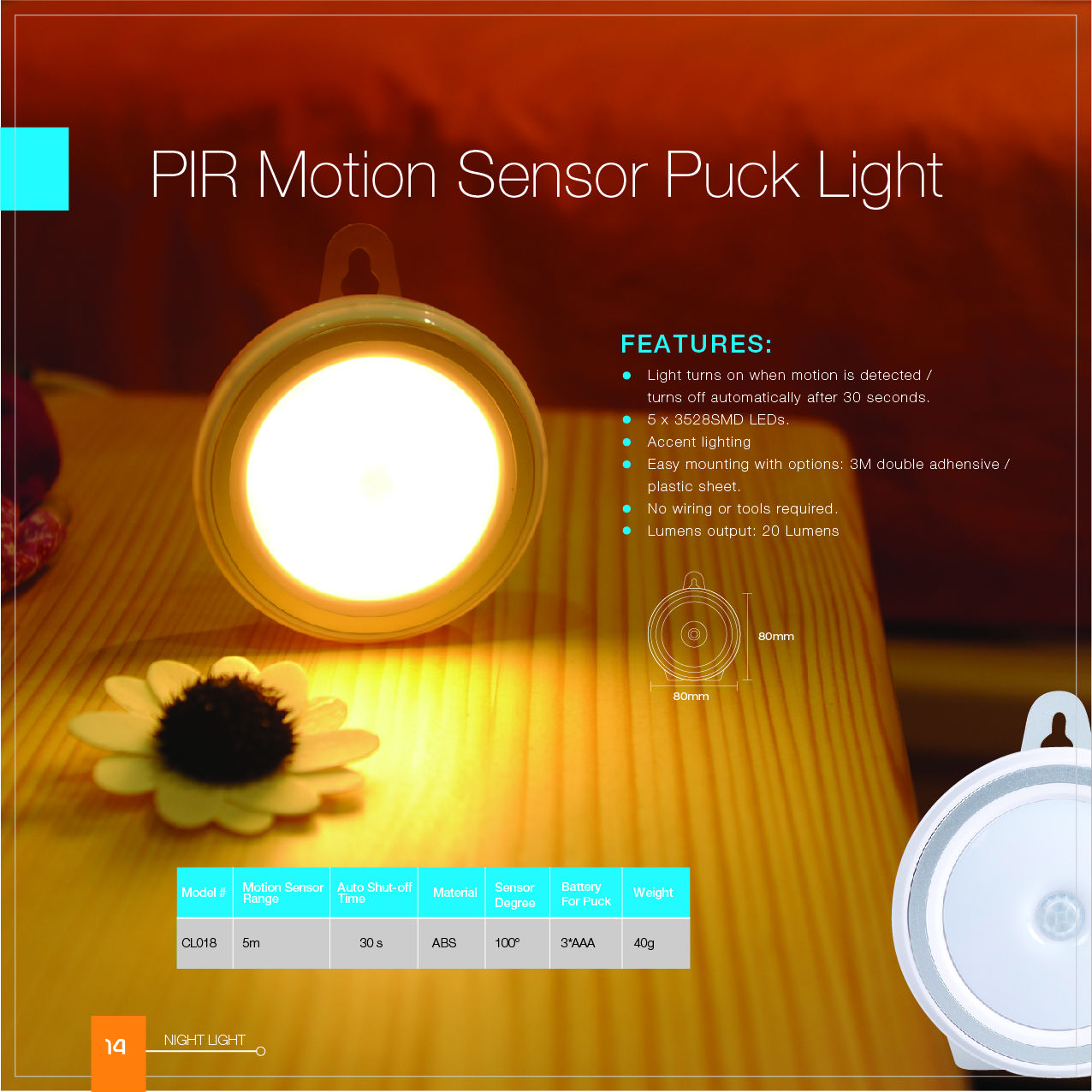 Highlighted here is a LED light in a portable round shape. It is powered by dry batteries and is equipped with motion, voice and touch sensors to provide multiple control options. This LED light uses 5 bright LEDs as the light source and is great for using as a torch, a cabinet light or a night light.
