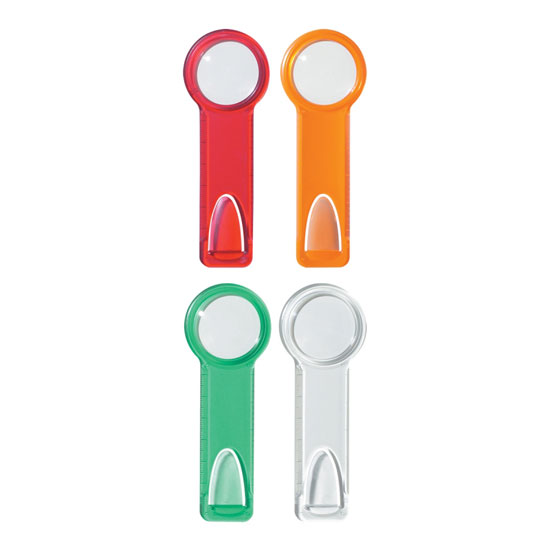 This portable magnifier comes in 4 translucent colors for a stylish look. The lens allows a magnified image of an object without distortion. Equipped with a small clip, this magnifier can be attached to your book and newspaper.