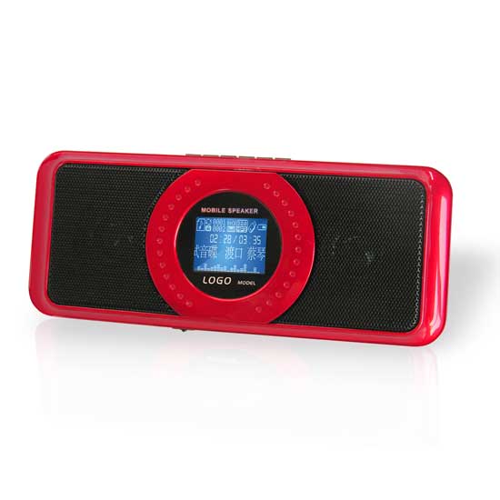 The ultra-sleek portable speaker features a panel-shaped construction with an LCD screen. It is designed to showcase song names and lyrics for added user-friendliness. This portable speaker comes with built-in FM radio and alarm clock functions.