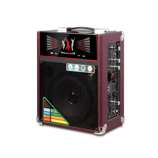 Displayed is a portable speaker that features a stylish appearance in imperial red with corner protectors. It comes with a dynamic colored display for extra appeal. This professional portable speaker supports guitar input.
