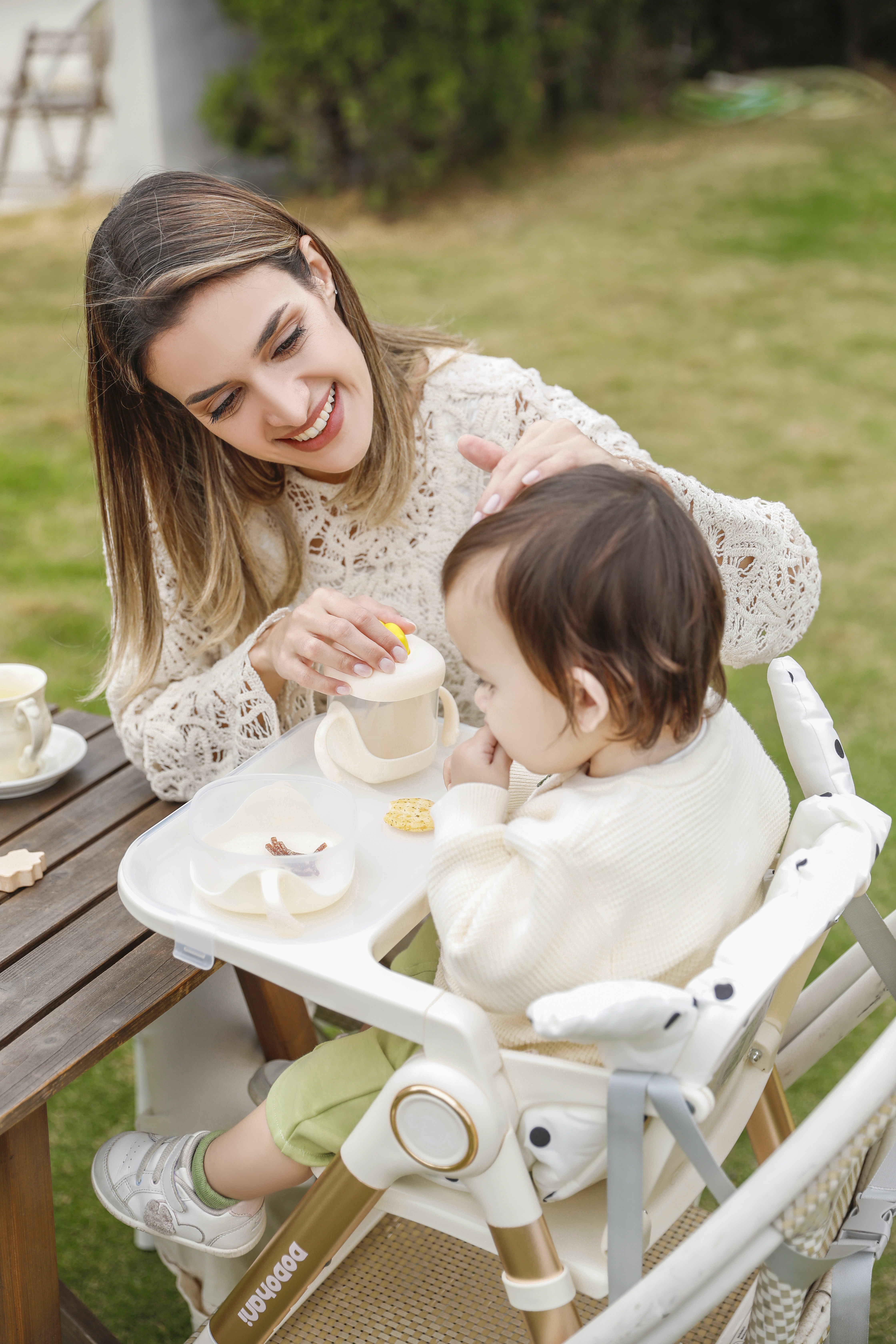 Hygienic Feeding Envir nment: Features a F d-Grade PP D uble-Layer Tray that is fully rem vable and dishwasher-safe, ensuring every meal is served n an antibacterial surface.