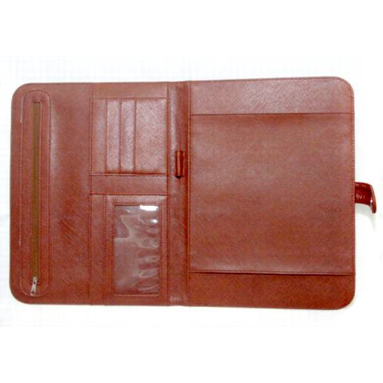 The portfolio is made of durable leather. It has a button closure. It has document bag, card holder, credit card holder and a zipper bag. A pen holder is also included.