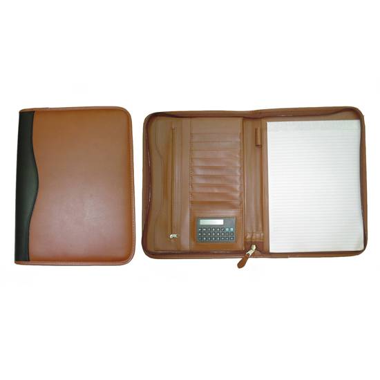 The organizer with a leather cover. It has 20 pages of writing pad. It is in zipper closure. It has a zipper bag and a calculator on the other side.