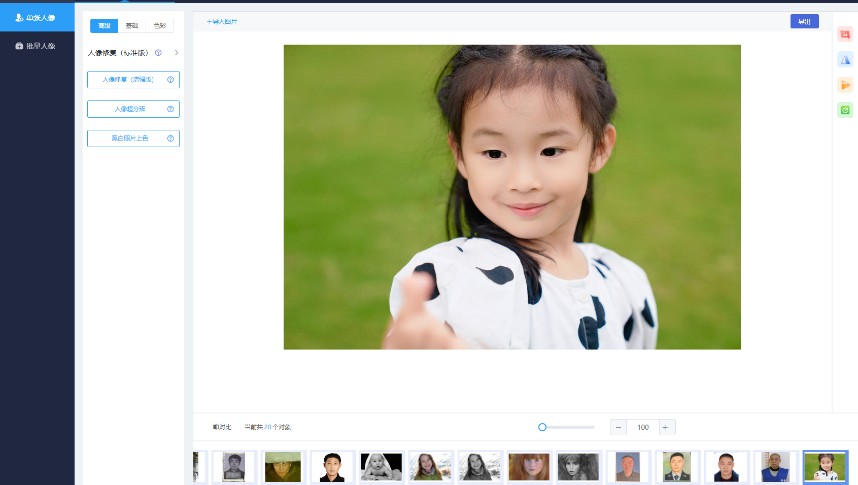 人像修复平台专注于低清晰度模糊人像的修复和增强。凭借先进的人像修复算法和 A 技术,它可以准确还原面部细节,提高图像分辨率,并使模糊的人像显得清晰和有质感。该平台适用于老照片修复、监控图像处理等场景,为用户提供高效、专业的人像修复解决方案,还原珍贵影像的光彩。