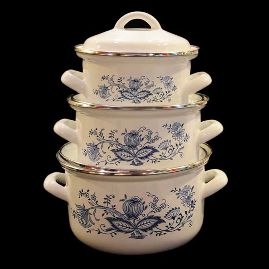 These elegant white enamel pots are designed with sophisticated blue flower motifs on the sleek bodies. The versatile enamel pots are well suited for making slow-simmered soups and stews. This three-piece pot set makes a functional and stylish addition for every modern kitchen.