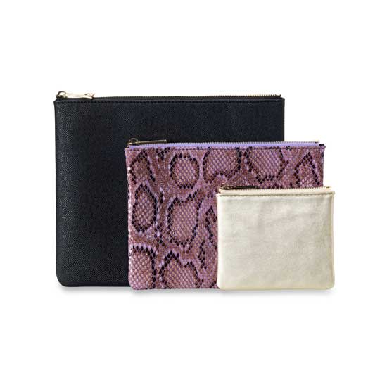 This exclusive pouch set includes three pouches in large, medium and small sizes. The functional pouches are designed with top zipper closures. They are perfect for organizing cosmetic tools, toiletries and other personal accessories.