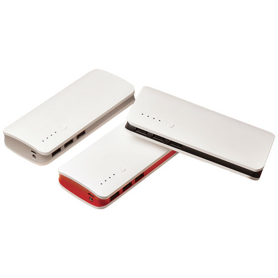 Pictured here is a finely manufactured power bank for charging on-the-go. It showcases a simplistic yet appealing two-tone design. The power bank is an ideal accessory for any gadget owner.