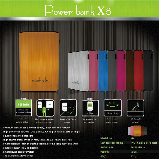 Power output, double USB port, 2.5A high-power output, can drive 2 sets of digital equipment at the same times, including iPad/iPhone/smart mobile/tablet PC/PD/PSP/GPS/MP4/MP5, etc.