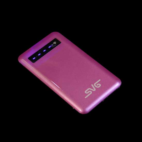 Displayed is a power bank that comes in a chic purple color. Made of aluminum, this power bank has a streamline shape with a shiny finish. This power bank has a large storage capacity of 4,000mAh.