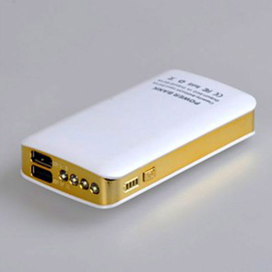 Displayed is a power bank featuring a white and golden finish. It offers stable and reliable electrical power to your electrical gadget. It is an ideal portable power source for outdoor use.