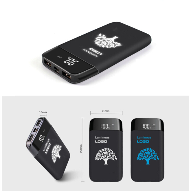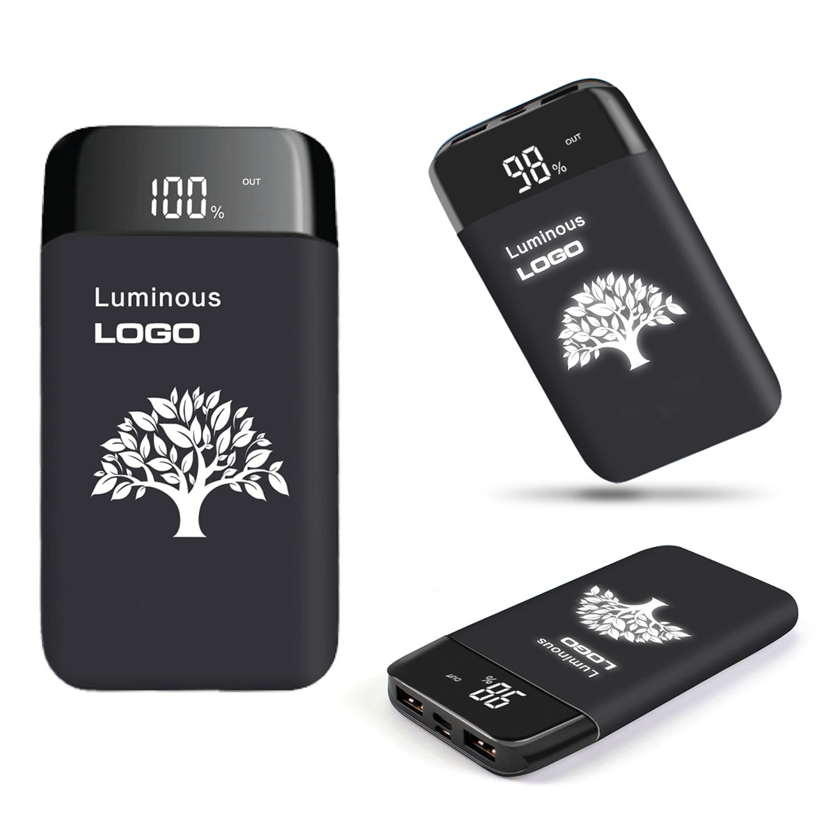 Featured here is a plastic powerbank with a LED lighting logo. It has an 8000mAh capacity and has two USB ports for efficient charging. This powerbank has a digital display to show the remaining power percentage and provide ample backup power for charging.