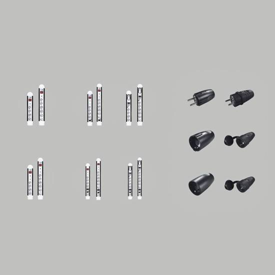 These are a series of power outlets and electricity adapters. The power outlets provides extra sockets for additional electric appliances. The electric adapters facilitates the use of electric products when travelling in other countries.