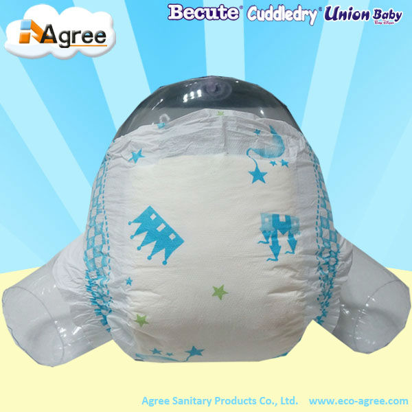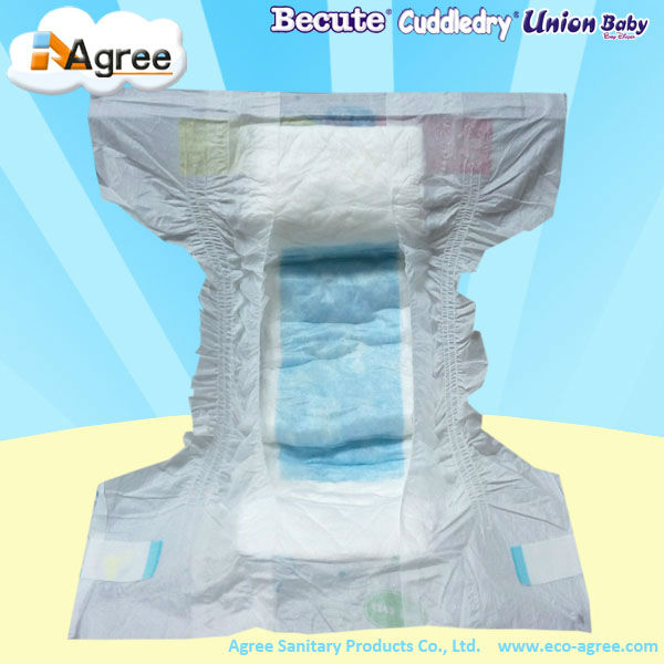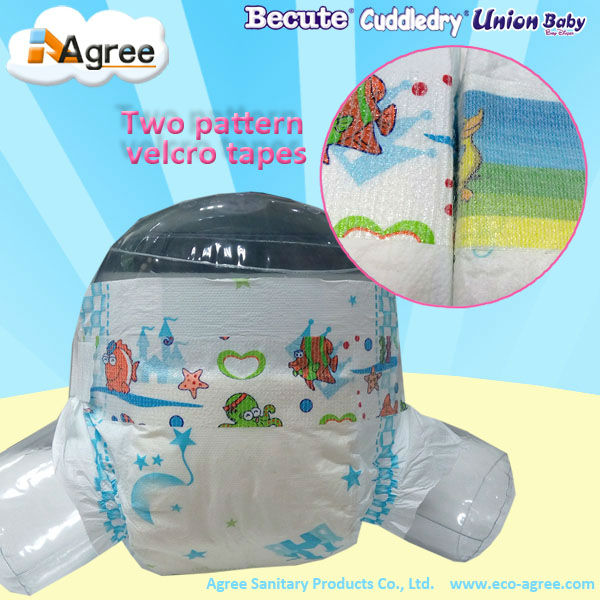 *Cotton like baby diaper, with adhesive frontal tape and side closure tapes. With double leak guard, with wetness indicator, remind mom to change the diaper in time.