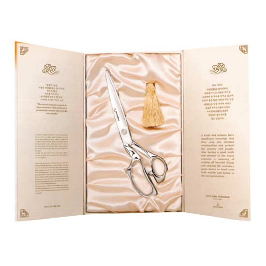 The premium yongmi scissors feature a stainless steel construction with a polished finish. They come packaged in a cardboard gift box for perfect presentation. These premium yongmi scissors make a great gift idea and surely are the perfect addition to your kitchen.