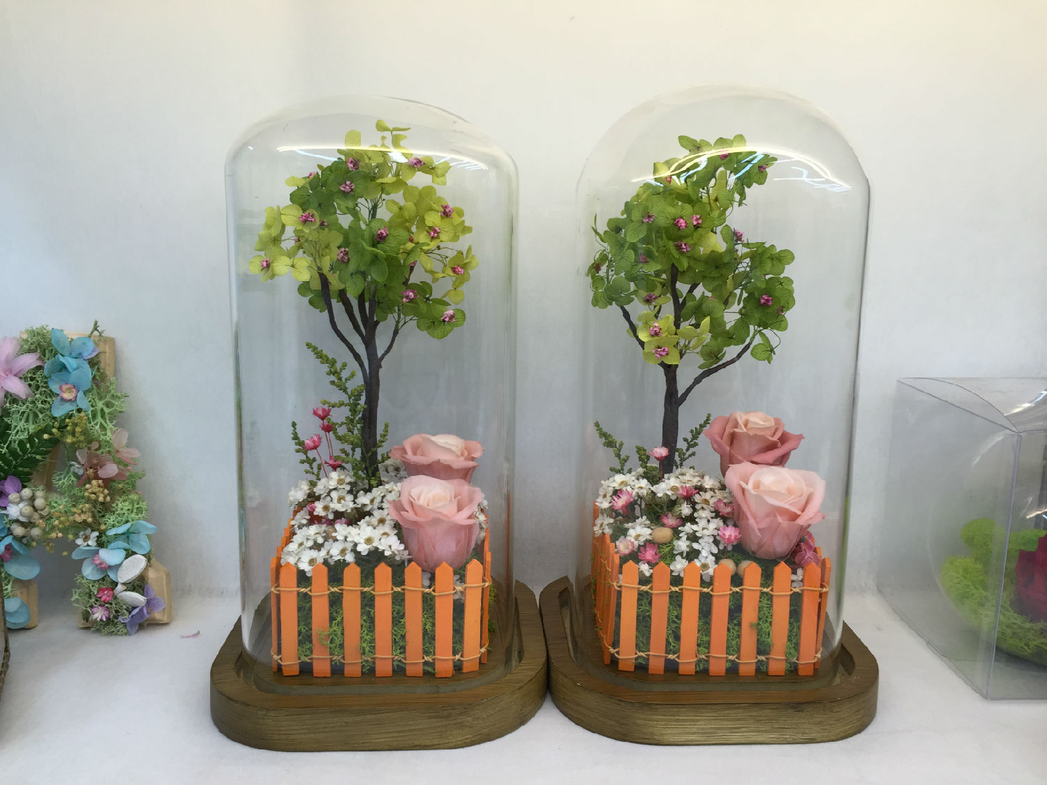 • A mini tree-shaped preserved flower decorated with some flowers on the side.