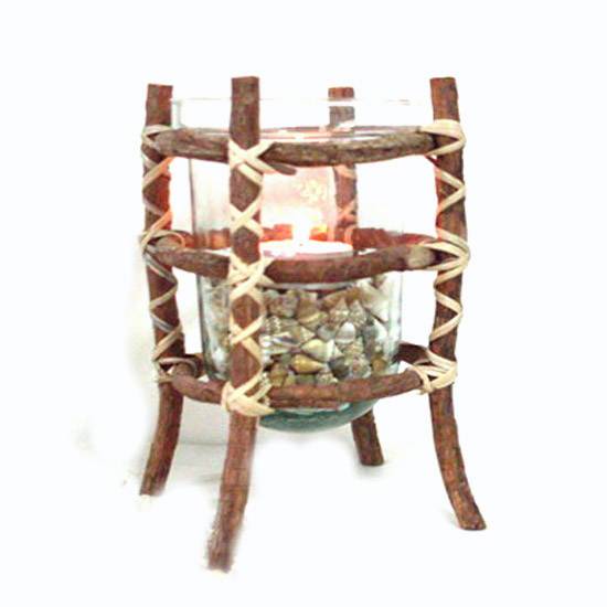 Adorn your house with the featured primitive-style decoration. It has a light held in a glass cup supported by a simple wooden rack. This decoration provides you pleasant illumination.