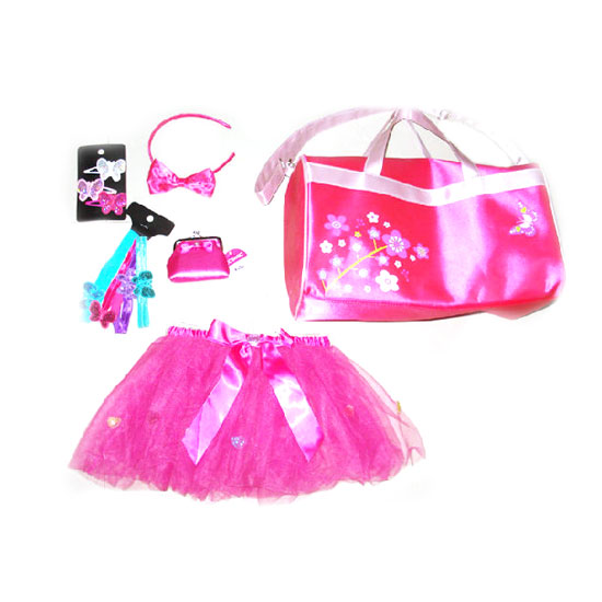 This princess costume set with a tulle skirt, handbag, pouch and multiple hair ornaments can surely delight any girl. Each piece is nicely embellished with ribbon, butterfly or flower decorations for an adorable touch. This amazing set is perfect for parties.