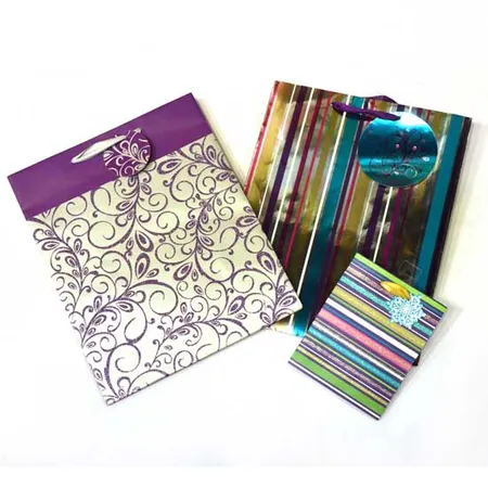 Displayed are printed bags which are made out of quality material. They showcase different attractive designs: swirly patterns, metallic stripes and stripes with a snowflake ornament. These pieces are simply practical and decorative.