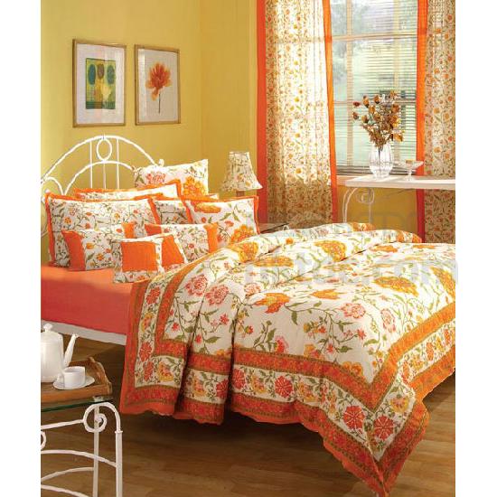 Coming to you is the handmade cotton bed linen flaunting a tender and sleek texture. It consists of a quilt cover, pillow covers and cushion cases in matching design. The bed linen touts a white finish with warm colored flowery patterns, which is in concert with vintage orange rim. Refined cotton filling is adorably assembled to furnish you with increased warmth and coziness.