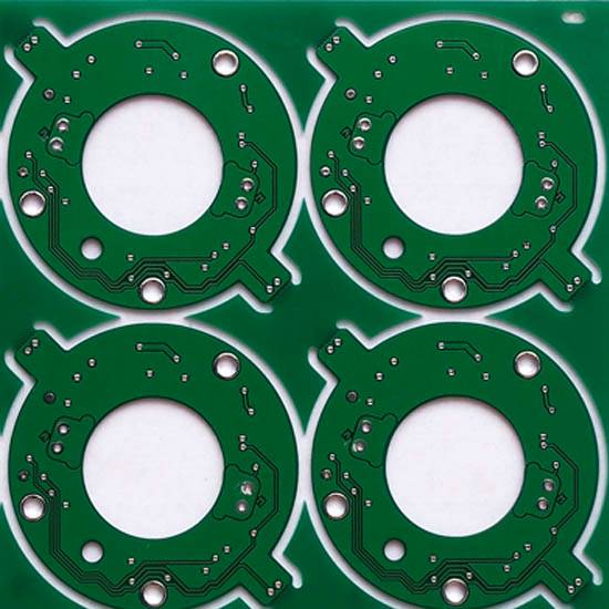 The double-sided printed circuit board features a rugged surface with silk screen printing. It is precision made with high quality performance. The printed circuit board is used in various electronic products including computers.