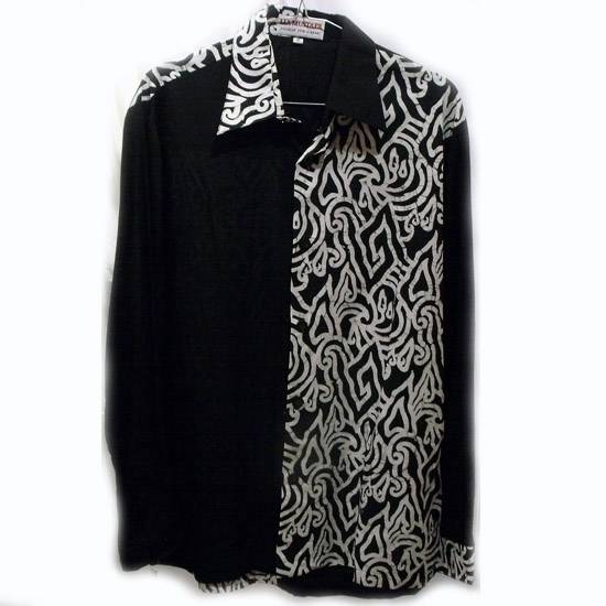 The men's black and white batik shirt comes with striking white swiveled patterns for an artistic appearance. It comes with a classic button-down front and long sleeves. This is a handsome casual wear for every man's wardrobe.