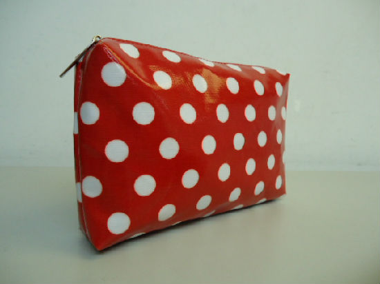 • Shine finish laminated cotton with one color printed polka dot cosmetic bag.