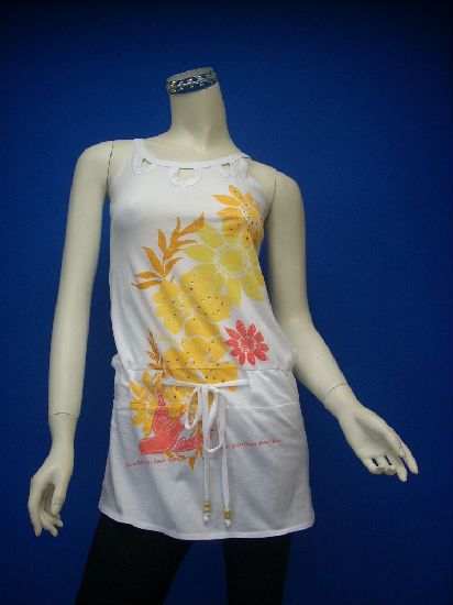 Demonstrated here is a printed tank top flaunting its brass printings and sparkling stones on the front. The tank top features a round neckline with cutout embellishments underneath. With the adjustable waist tie, ladies can flexibly adjust the tightness of this tank top.