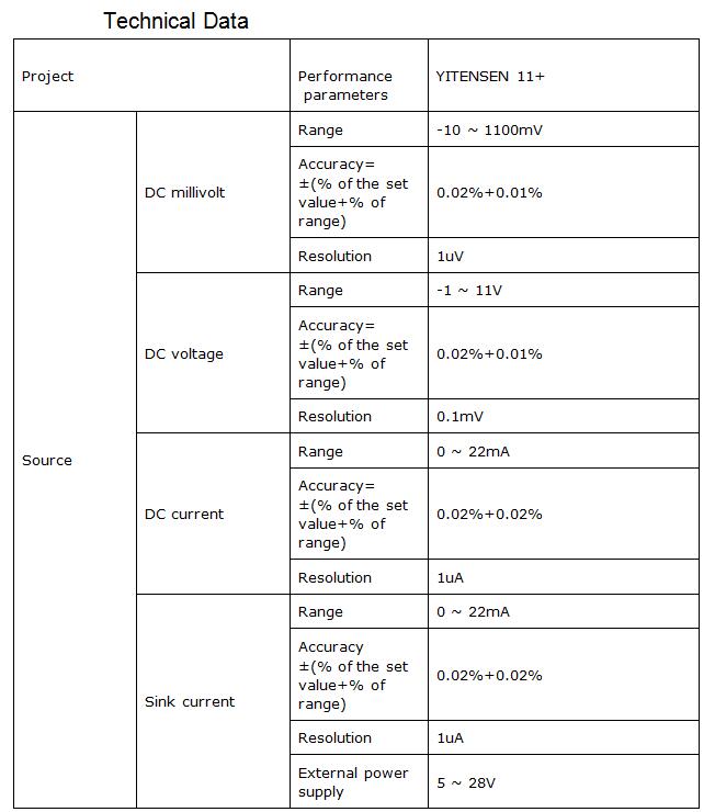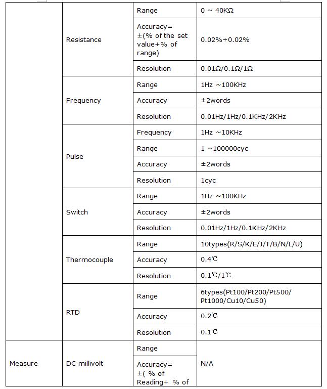 The output function: DC voltage, DC current, ohm, analog transmitter, thermocouple, thermal resistance, frequency, pulse, switch.