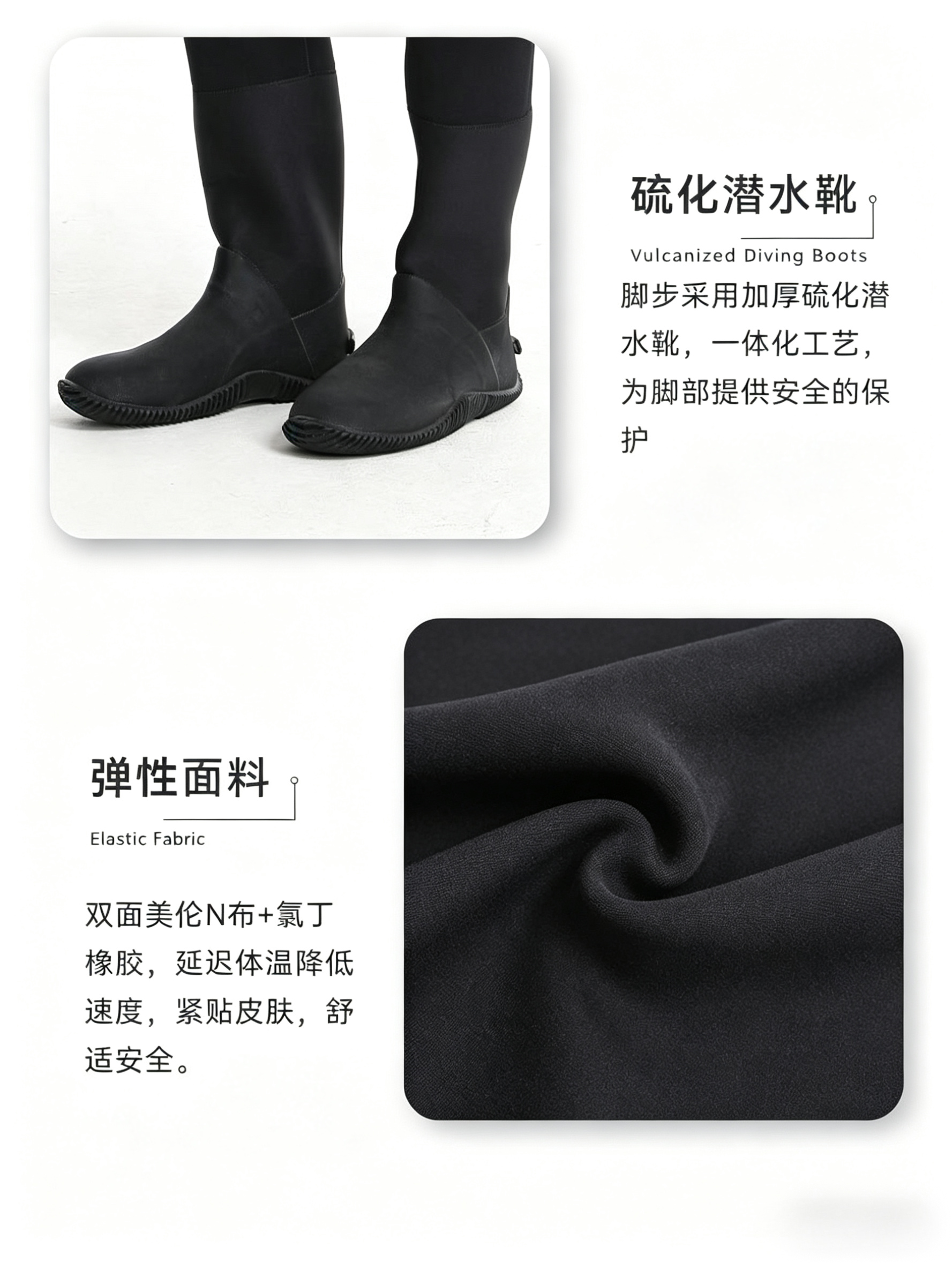 3. Integrated Vulcanized Diving Boots: Thickened vulcanized rubber boots with integrated craftsmanship provide full-foot protection, anti-slip grip, and thermal insulation for deep diving.