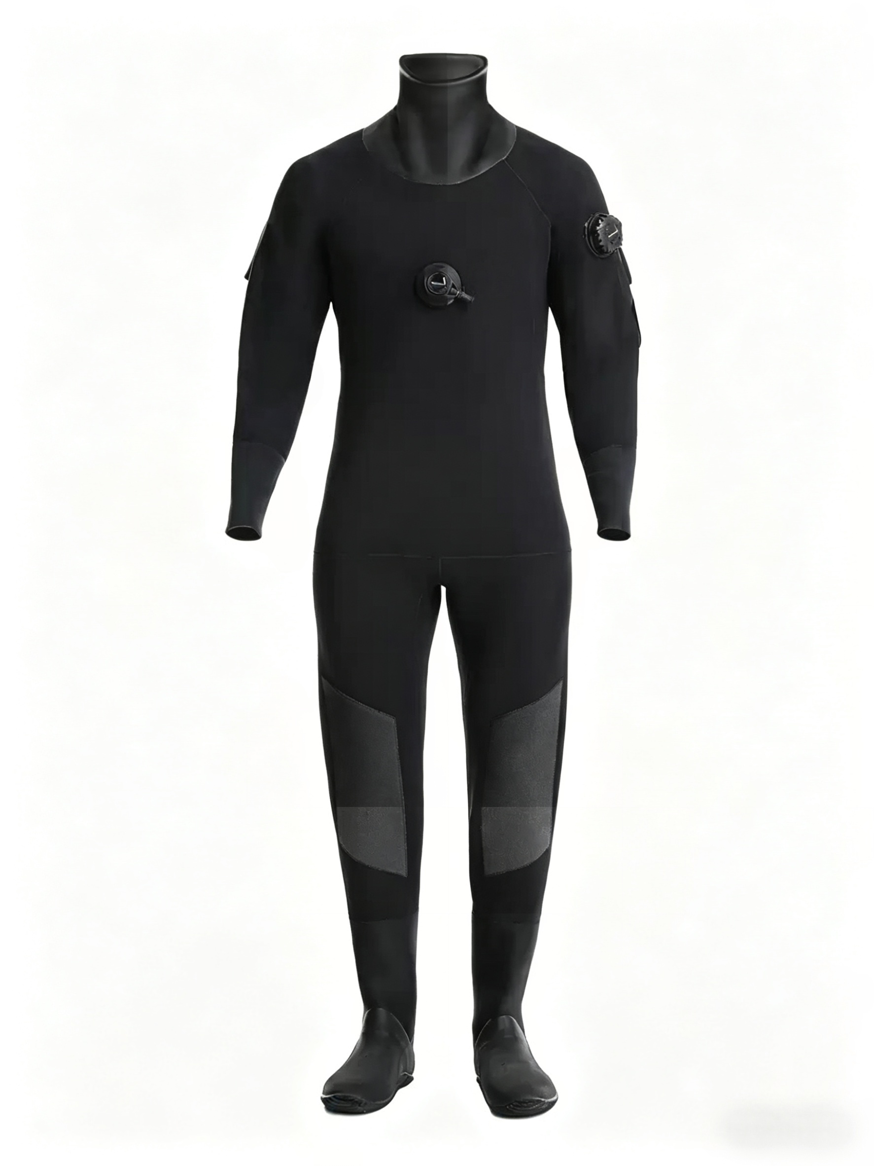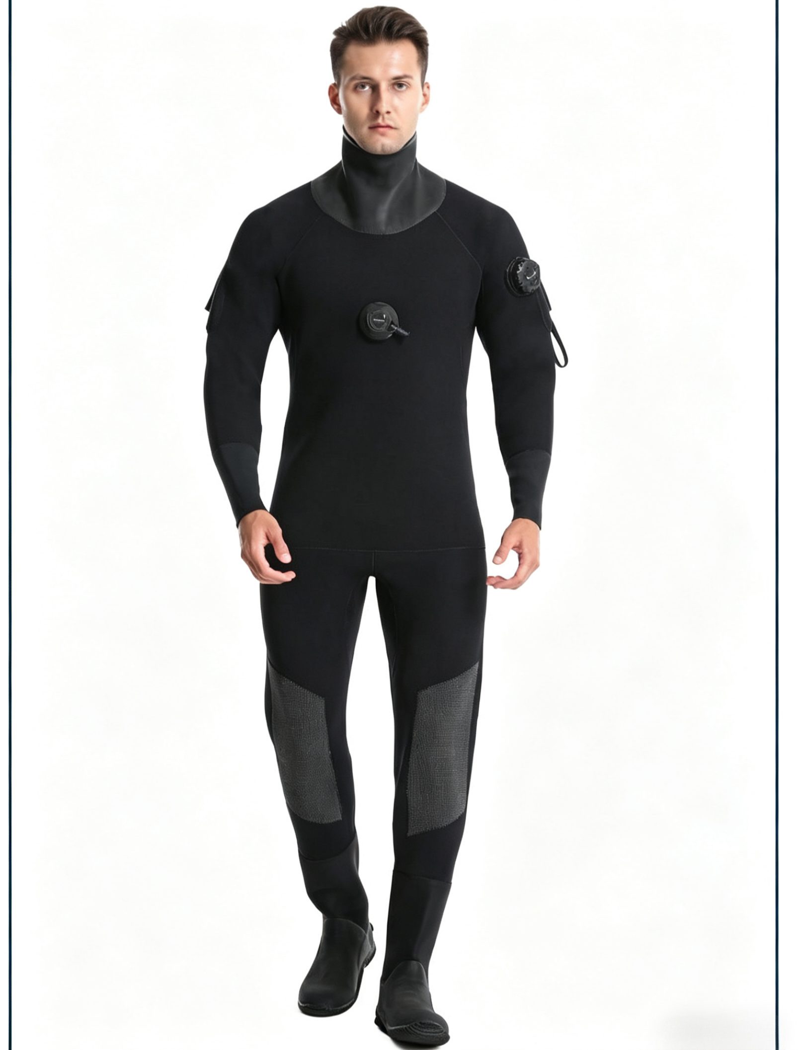 dry diving suit, professional scuba drysuit, deep sea diving suit, drysuit with breathing valves, vulcanized diving boots, neoprene dry suit, technical diving suit, cold water diving suit, drysuit with exhaust valves, scuba diving gear