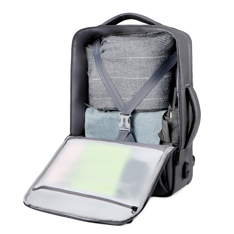 Inside, the backpack offers multiple compartments to keep your items organized. The first layer includes a dedicated sleeve for a 15-inch laptop and a separate pocket for a tablet. The second layer features a dry-wet separation bag, perfect for keeping wet and dry items apart during your travels. An elastic clothing strap is also included, making it easy to secure and organize your clothes.