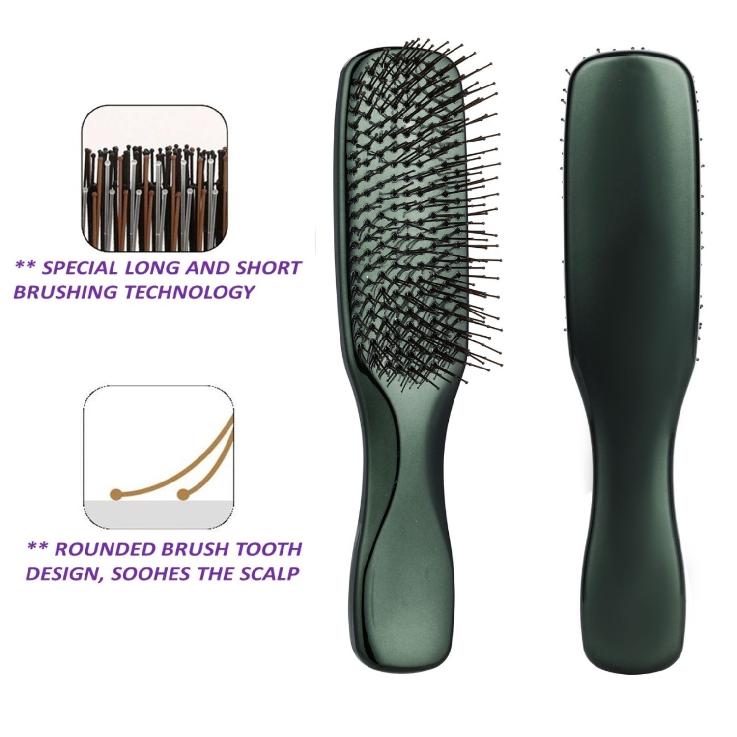 Plating Massage & Detangling Brush. Special long and short brushing technology. High-temperature resistant bristles. Anti-Static, No Pulling.