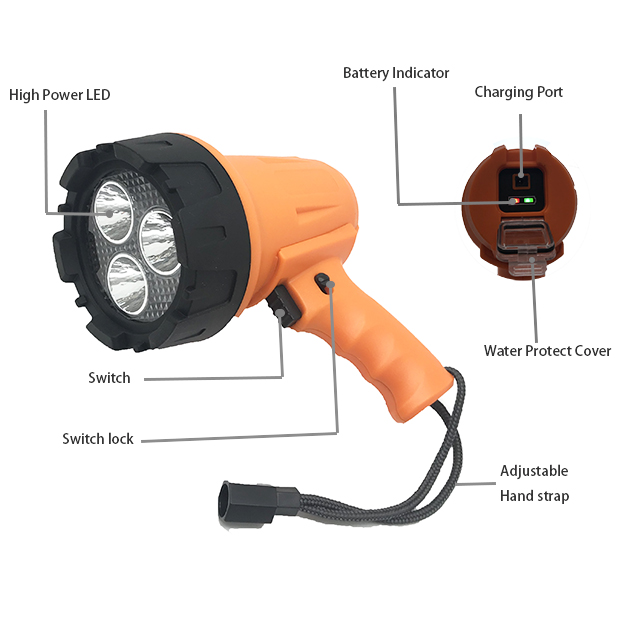 The portable LED spotlight for outdoor searching, marine, boating, hunting, exploring, climbing, camping, hiking, fishing, etc