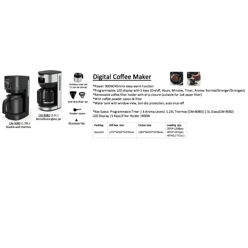 900W coffee machine with 1.5L high borosilicate glass carafe, visible water tank, digital countdown display, and 6 control buttons. Features anti-drip, keep-warm, and cord storage functions, plus a removable filter and measuring spoon. Ideal for home and office use.