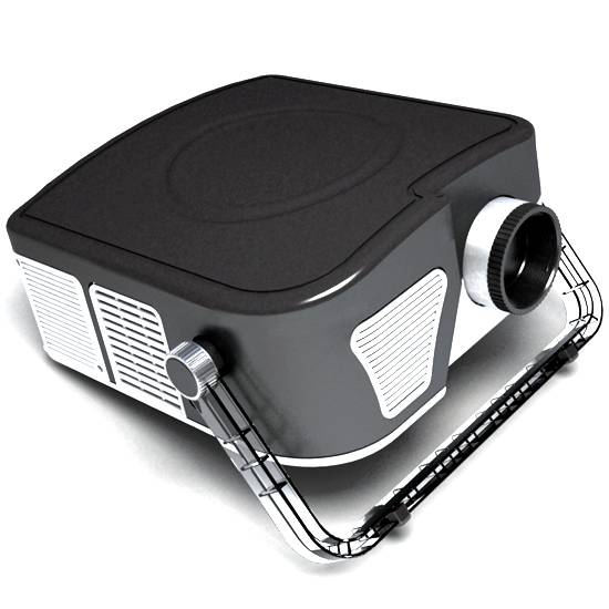 This is a projector which is equipped with a black coloured plastic casing. The projector can be used as an overhead projector.