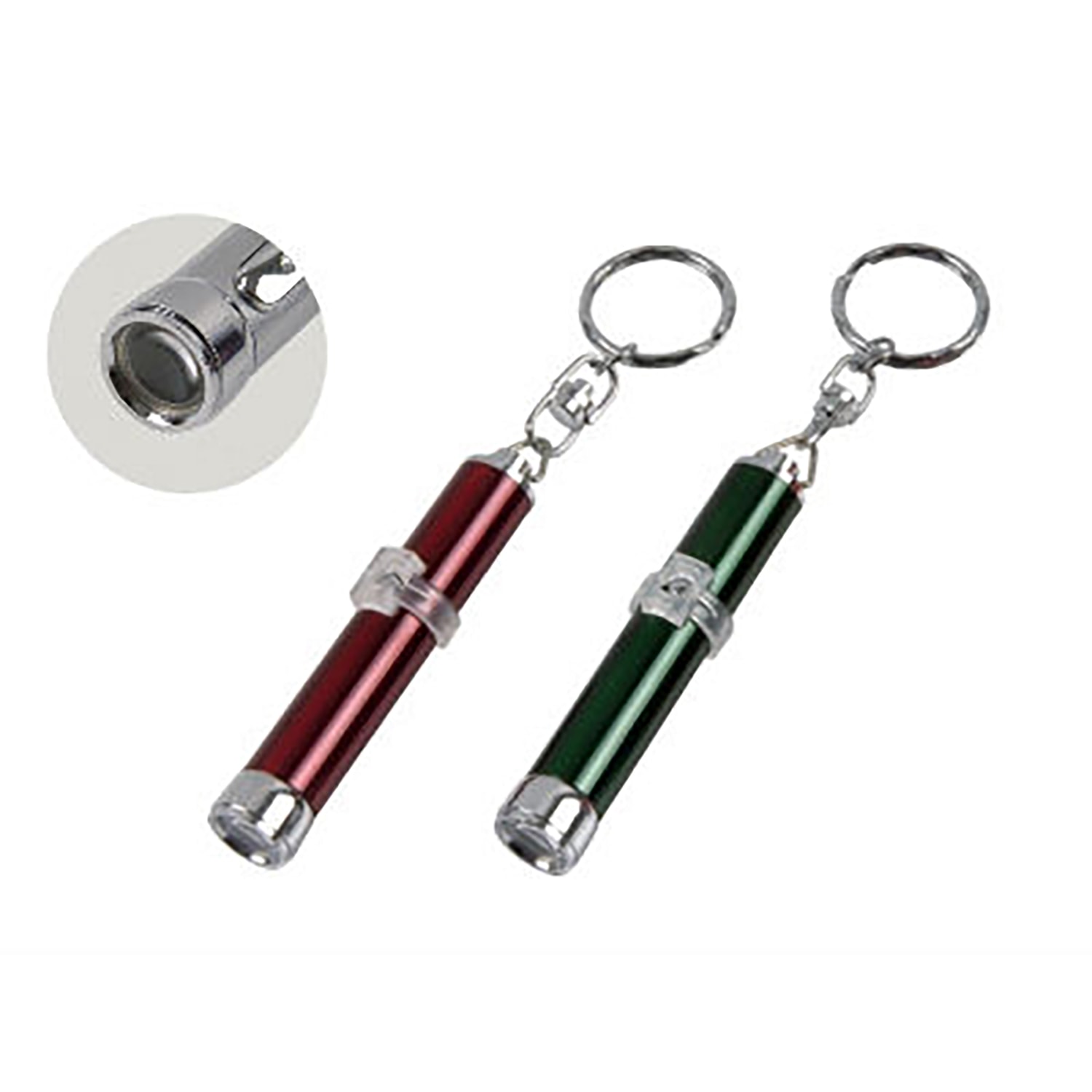 These LED keychains are installed with white LEDs as projector pointers. Slightly press the button in the middle to operate this LED pointer easily. With key rings at the end, users can handily bring these LED mini torch everywhere.