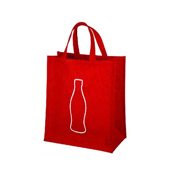 The displayed bag features a bold red toned appearance with a white bottle pattern at the front. It is made of natural jute for extra robustness. This eye-catching bag is ideal for promotional use or carrying giveaways.