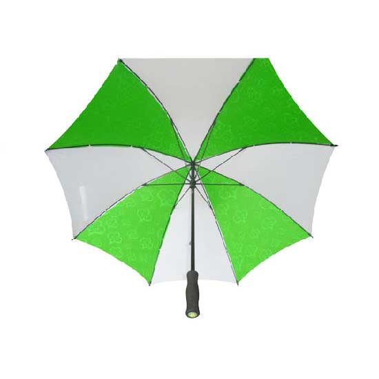 Displayed is an 8-panel golf umbrella coming in green and white. It is equipped with a fiberglass frame, pongee fabric panels and an EVA handle. Your logos can be printed for promotional use.