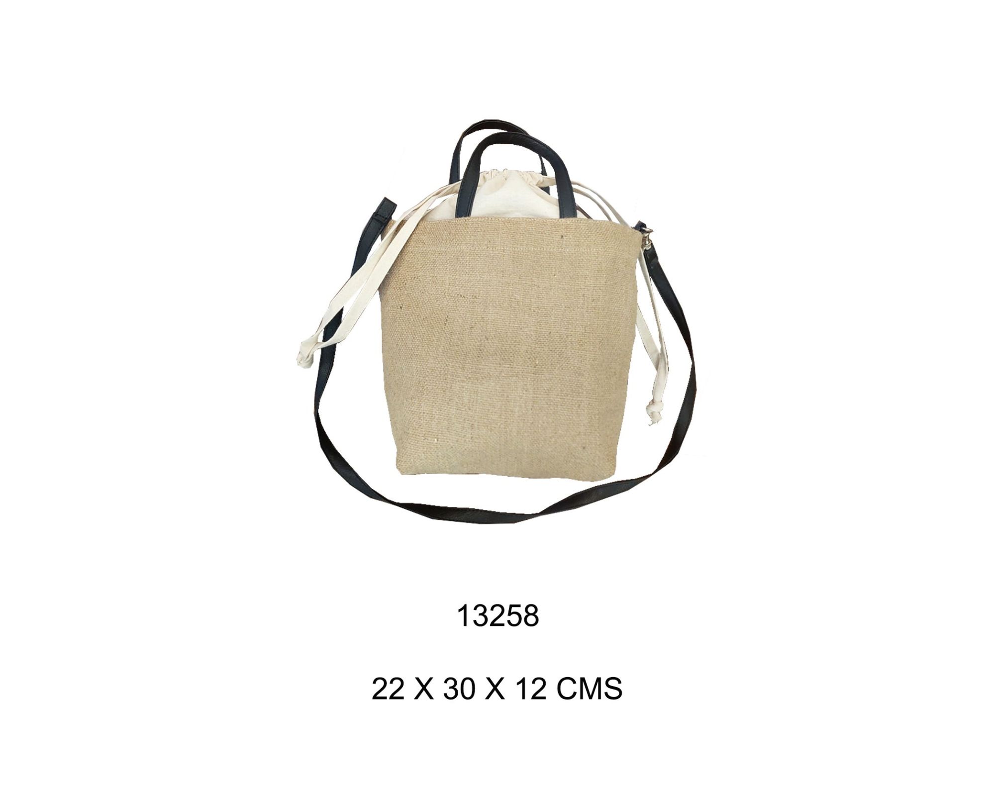 Natural Washed Jute and 04 Ozs Natural Cotton with PU Strap handles.