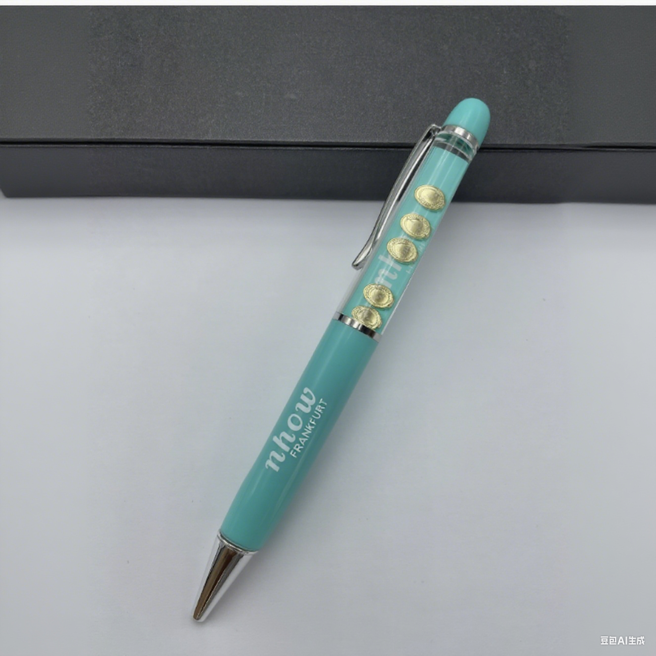 This is a liquid pen with customizable color. Inside its transparent tube, there is a colorful background image along with several golden coin-shaped 3D floaters. It perfectly combines creativity and ornamental appeal, making it an ideal choice as a unique cultural and creative gift or a brand-promotion item. It adds fun and personality to the writing experience. We accept OEM/ODM.