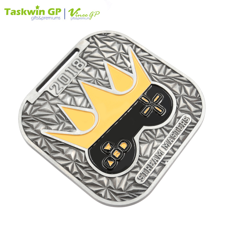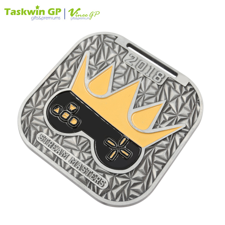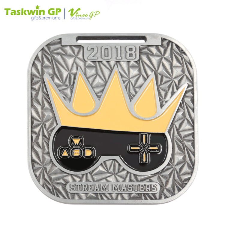 Coming in a 2D antique nickel-plated design, this die-cast zinc alloy medallion is excellent for using a gift or an award. It has the design of a crown on a gamepad and has a hole on top for attaching to ribbons. This zinc alloy medallion flaunts outstanding craftsmanship and is available in customized designs.