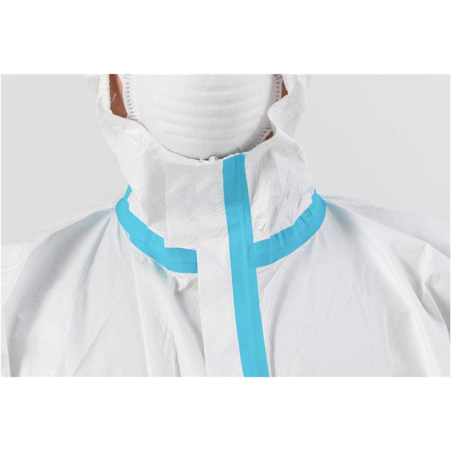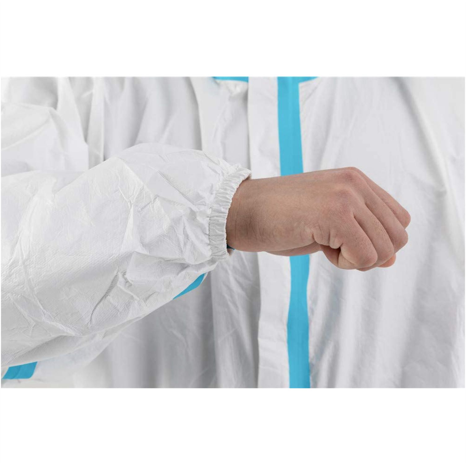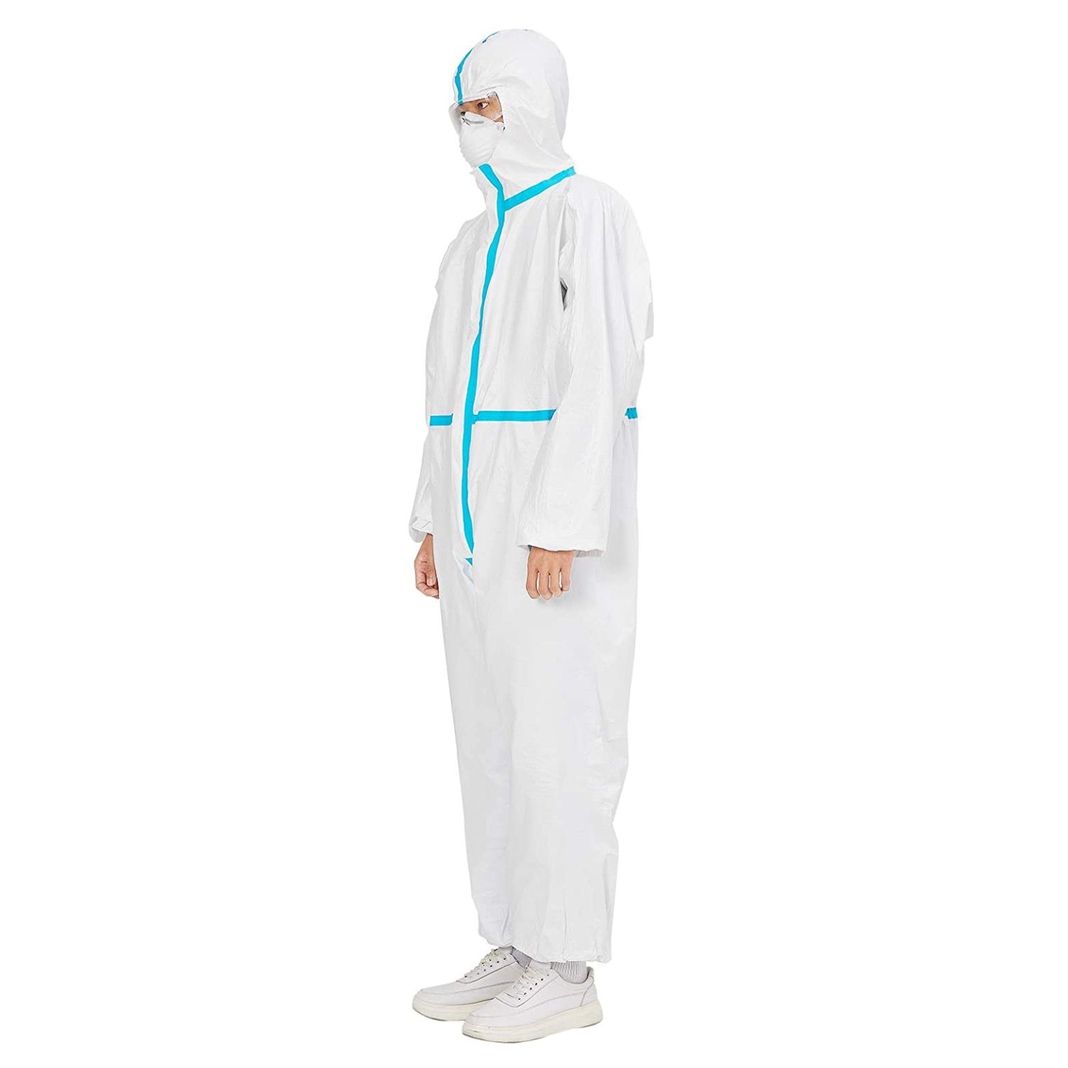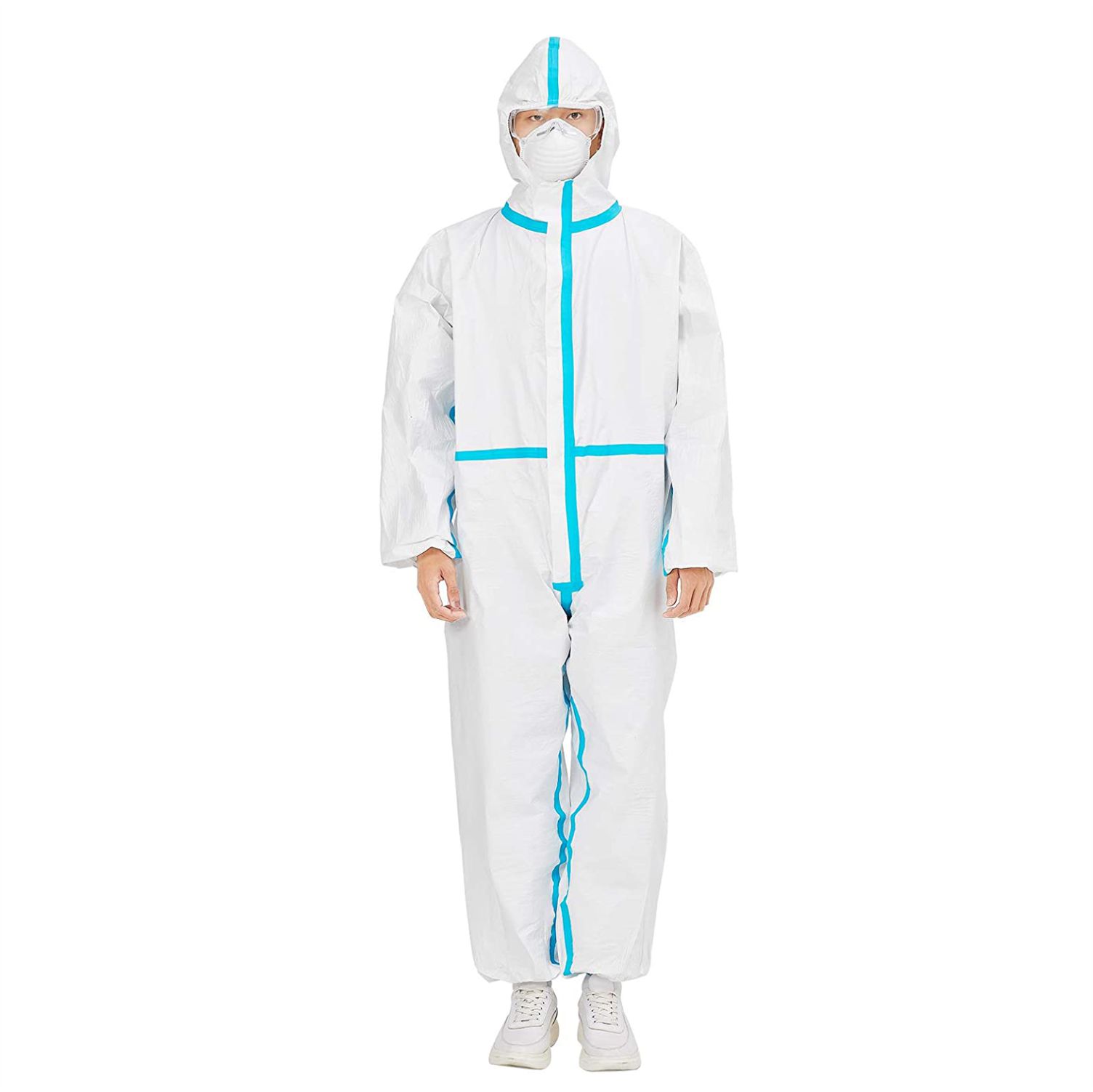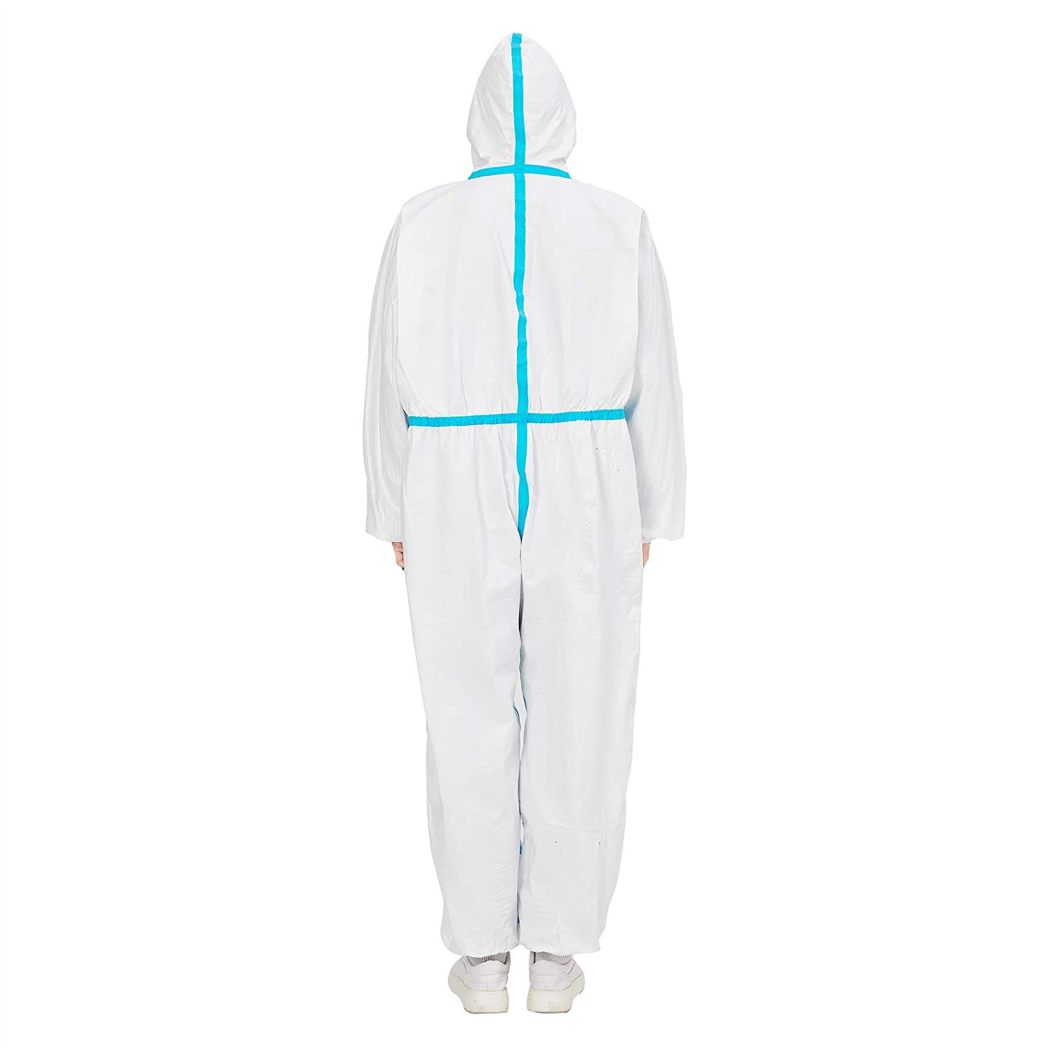 Front long zipper, elastic cuffs, waist,ankles and attached hood, serged seams to help provide higher standard protection.