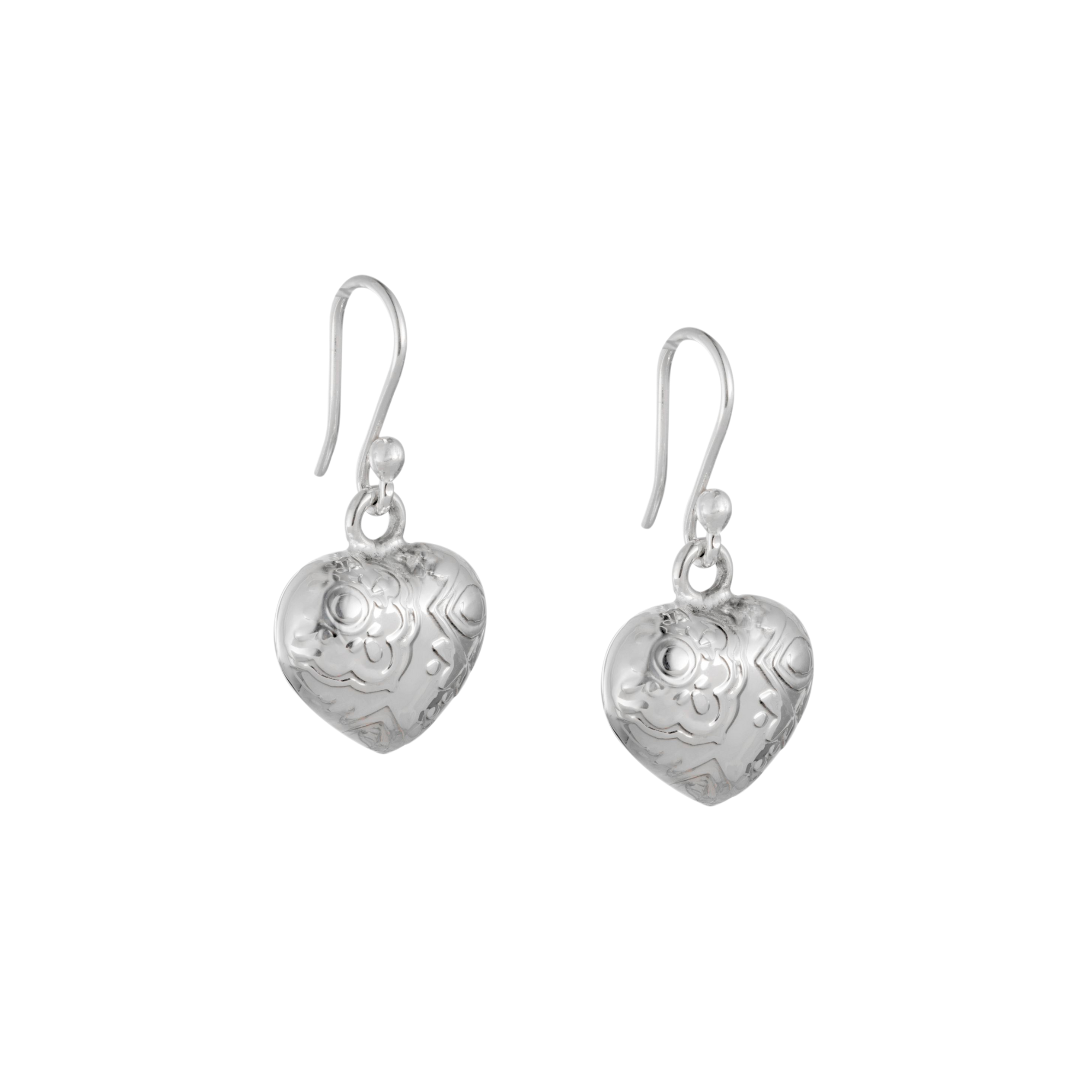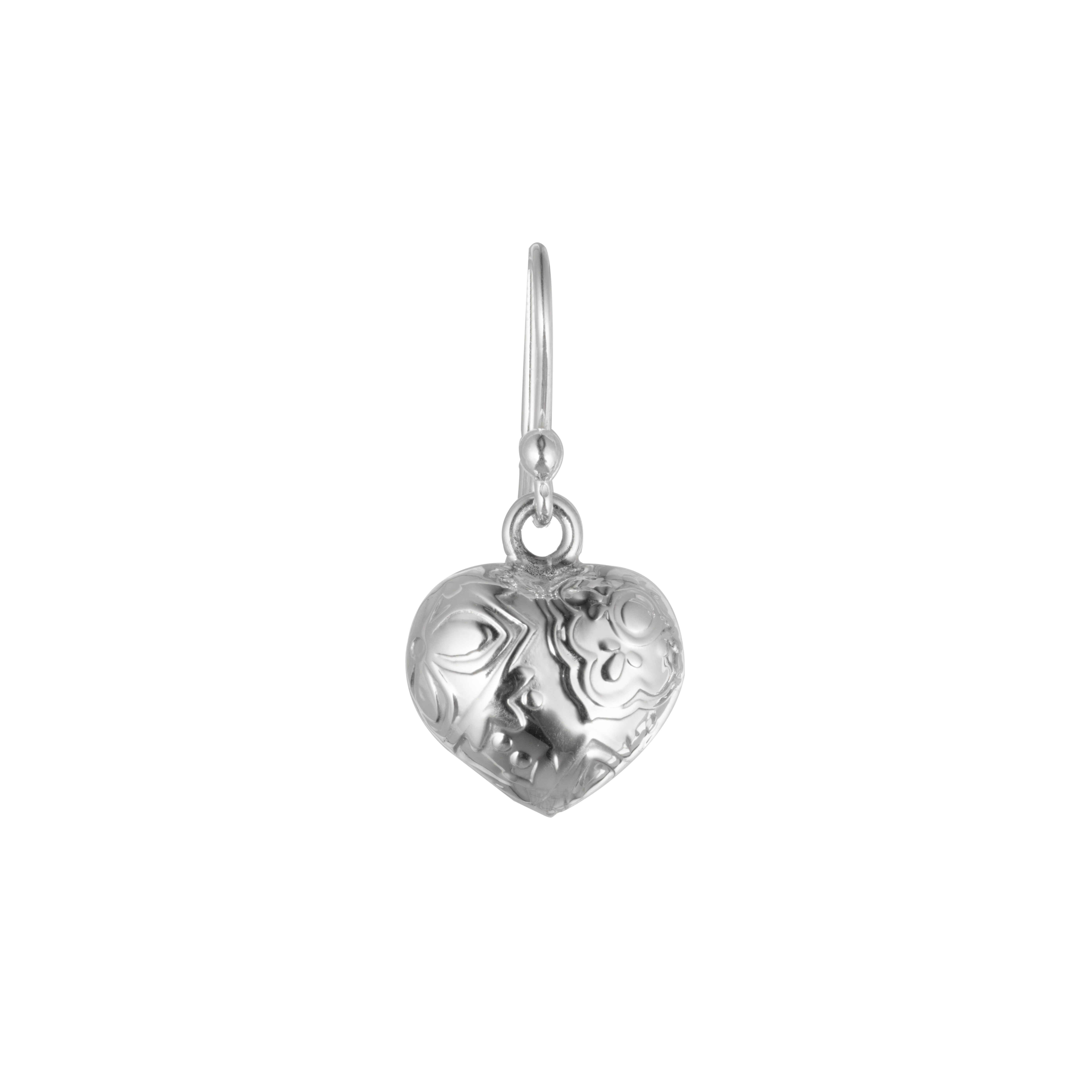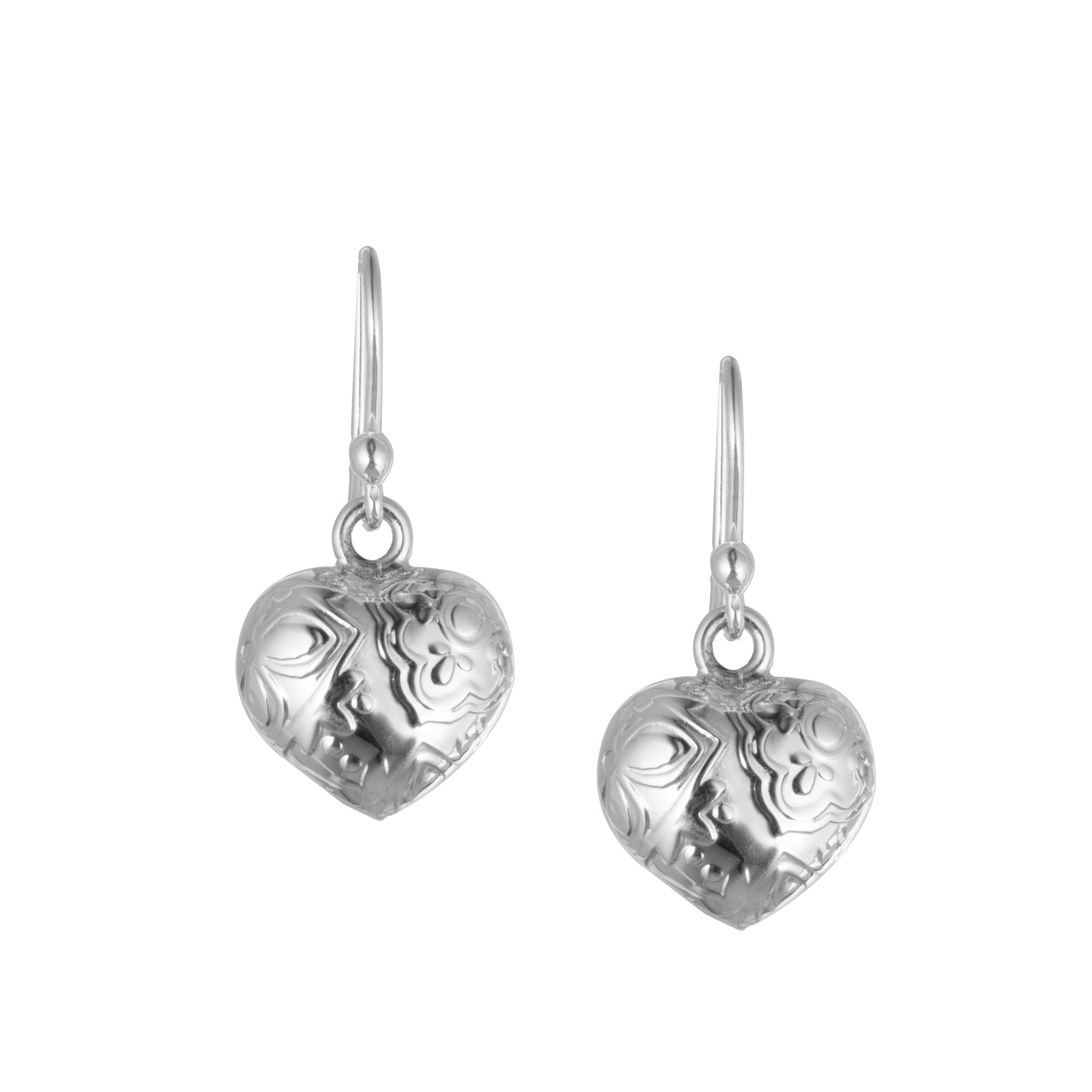 Design: Dangling earrings with puffed hearts and upholstered engraving