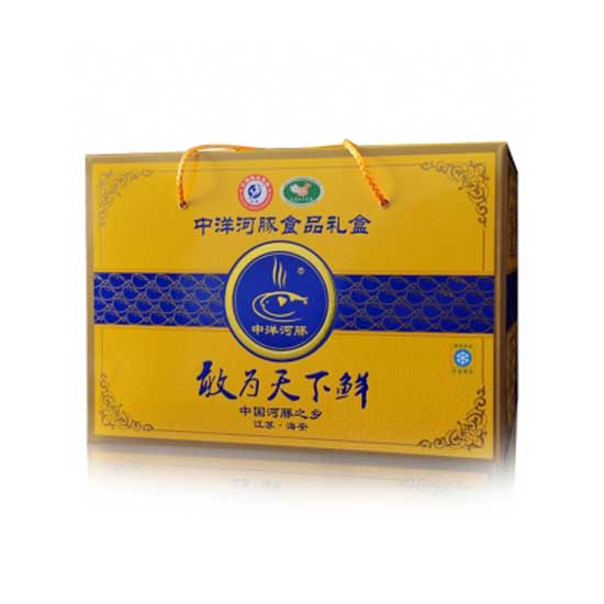 Displayed is a pufferfish snack mini gift box that comes in nice packaging. With carefully selected dishes, this gift box is a hot sale combo item due to its rich tastes. The pufferfish snacks are all local specialties for your enjoyment.